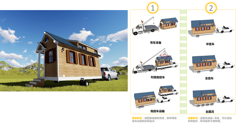 1. 整体移动:装配基地组装完成,整体用拖挂车运送到安置地点。